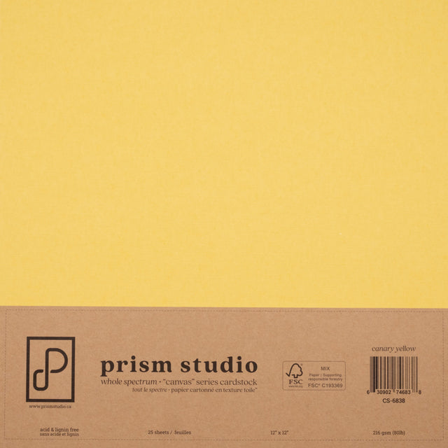 Prism Studio Whole Spectrum "Canvas" Series is a premium collection of textured 12" x 12" cardstock available in 25 vibrant hues, featuring a surface texture inspired by the rich depth of traditional canvas. The colour-core means no white edges, and solid colour throughout. 80 lb, (215 gsm), acid & lignin free, and sold in packages of 25.
